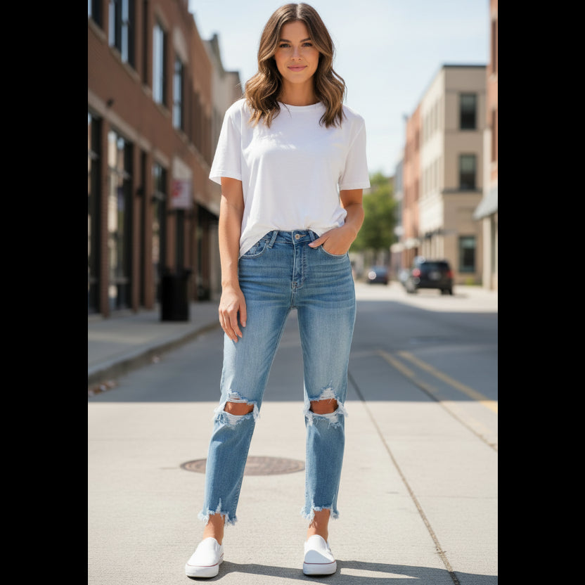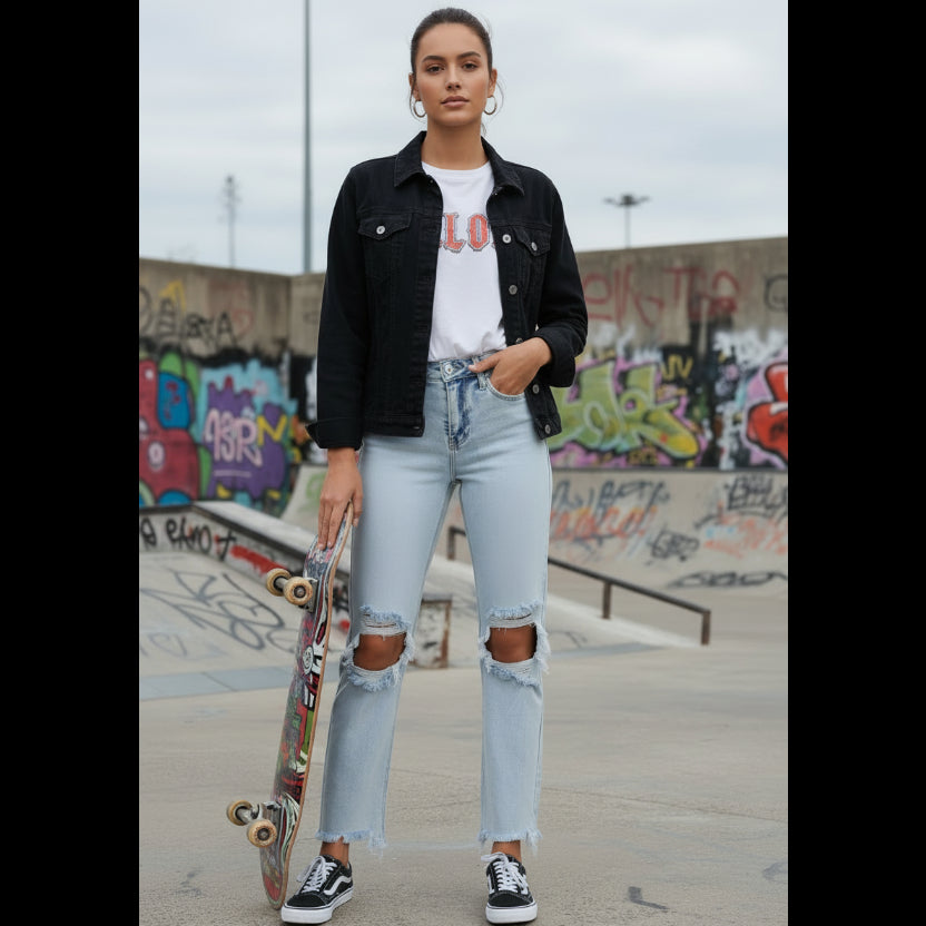 - Design Rippé : Détails déchirés qui ajoutent une touche trendy.